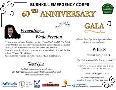 On November 15, 2025, Bushkill Emergency Corps will celebrate its 60th Anniversary! Our 6th Gala will be held at the Shawnee Inn. Cocktail hour will begin at 6:00 PM, followed by dinner at 7:00 PM. Entertainment will take place after dinner.
